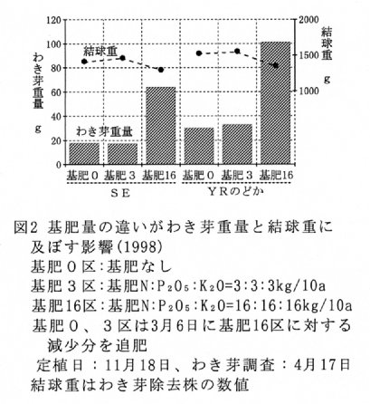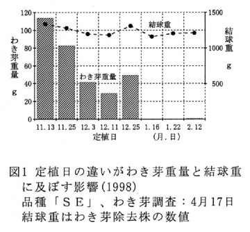 - わき芽の発生は1996、1997、1999年に株当り500~850g発生し、放置した場合の結球重は、わき芽除去株に対し、75~84%となる。1998年は2月の気温が特に他の年よりも高く、わき芽の発生は84gと少なく、結球重への影響がみられない(表1)。