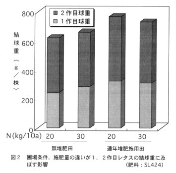 - 圃場条件としては、連年毎作堆肥を2~3t/10a施用している腐植に富んだ圃場で適応性が高く、生育、収量、品質とも良好となる。堆肥を施用していない圃場では1、2作とも生育は劣ることから、地力を高めることで、施肥量を抑え安定した生産が可能となる(図2)。