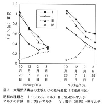 - 肥料の違いによる栽培中の土壌ECについてみると、SLは初期のECが低く抑えられ1作目の生育が安定する効果がみられる。SIBおよび慣行肥料は、高温での溶出が早まり初期のECが高く、過繁茂をまねく傾向がみられる。無マルチ追肥区は、ECが低く流亡が著しい(図3)。