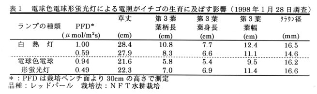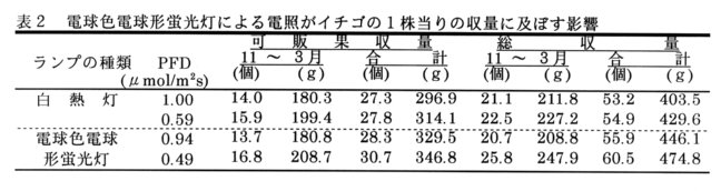 - イチゴの電照には、白熱灯が利用されている。しかし、白熱灯は寿命が短く、電力の光への変換効率が悪いため電気料金が割高である。そこで、長寿命・低電力消費の電球色電球形蛍光灯による電照の実用性を明らかにする。