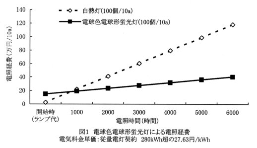 - 10a当りの経費は、白熱灯(60W)では1000時間ごとに電球250円×100個+電力6000kWh×28円/kWh=193000円かかる。これに比べて蛍光灯(15W)は最初の1000時間が蛍光灯1500円×100個+電力1500kWh×28円/kWh=192000円と白熱灯と同じに、それ以降は6000時間までは電気料金のみ(1000時間ごとに電力1500kWh×28円/kWh=42000円)となり、2作目以降(1作当りの電照時間を750時間とする)は蛍光灯が安くなる(図1)。