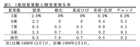 - 裂果は7果で6.5%、放任で8.5%と多いが、5果、6果、8果では2%台である。軟化は7果以上で発生し、7果及び8果では1%未満、放任で7%である(表3)。