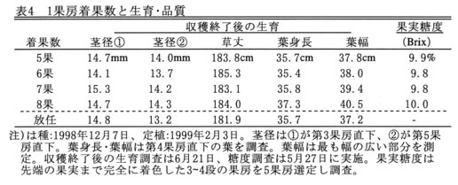 - 収穫終了後の生育調査では、5段摘心の場合、着果数が5~8果では放任に比べて生育に顕著な差は認められない(表4)。