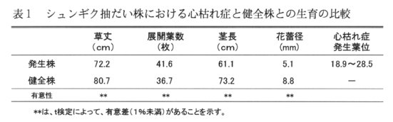 - シュンギク心枯れ症を発生した抽だい株は、草丈・茎長が低く、花芽の発達が遅れるが、葉を多く展開する。そして、障害葉が多い株ほど展開葉が多く、栄養生長が過多な株ほど心枯れ症を起こしやすい傾向を示す。