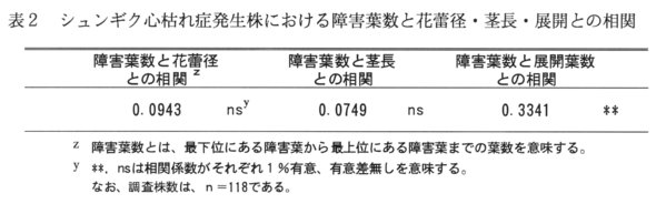 - 心枯れ症の発生株では障害葉数と展開葉数との間に有意な正の相関があるが、障害葉数と花蕾径、障害葉数と茎長の間には有意な相関は認められない(表2)。