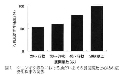 - 展開葉数別に心枯れ症発生株の割合を調査した結果、展開葉数が多い株ほど心枯れ症を発生している割合が多い(図1)。
