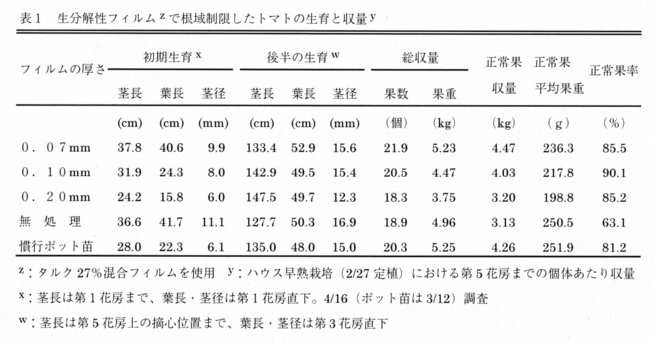 - 生分解性フィルムで根域制限することにより、若苗定植したトマトの初期生育を抑制し、正常果率を高めることができる。トマトの根はフィルムの分解にともなって伸長するので、慣行の成苗定植に近い生育を示す。