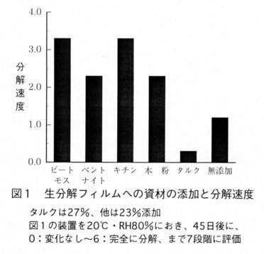 - 生分解性フィルムS-2(T社製、成分:脂肪族ポリエステル)に、ピートモス、ベントナイト、キチンおよび木粉を添加すると分解速度が速まり、タルクを添加すると遅くなる(図1)。タルクを添加したフィルムは薄膜化が比較的容易であり、原料コストの低減と分解速度の調節が可能である。
