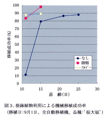 - 根鉢植物の利用により播種後11日苗でも全自動移植機による移植が可能となる(図3)。