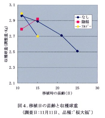 - 根鉢植物なしの場合の収穫適期は若苗でやや遅れるが収穫時の球重は移植時の苗齢が若いほど大きい。根鉢植物にソルゴーを用いた場合も同様である。イネの場合は11日苗より15日苗が優る(図4)。
