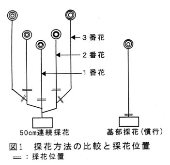 - フロリバンダ系品種‘バレリー’をアーチング仕立てで栽培し、採花枝の蕾が通常の切り前になった時に、花頂部から50cmの長さで収穫する(1番花)。次に採花母枝から伸長してきた枝を再び花頂部から50cmの長さで収穫する(2番花)。次の採花母枝から伸長してきた枝を葉腋部で収穫(3番花)した後、母枝を株元まで切り戻す(図1)。