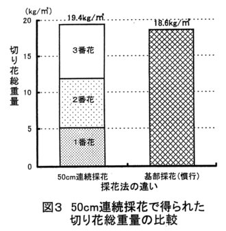 - 切り花総重量(切り花重量×切り花本数)は、50cm連続採花区では19.4kgになり、慣行の基部採花区に比べて約4%増加する(図3)。