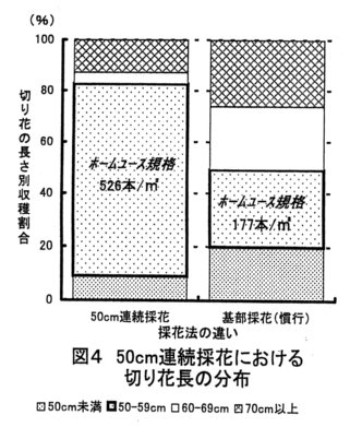 - ホームユース切り花の規格を実際栽培では少し余裕を持たせて50~59cmとすると、この規格に適合する切り花の収穫割合は50cm連続採花区では73.8%、慣行の基部採花区では29.3%になる(図4)。