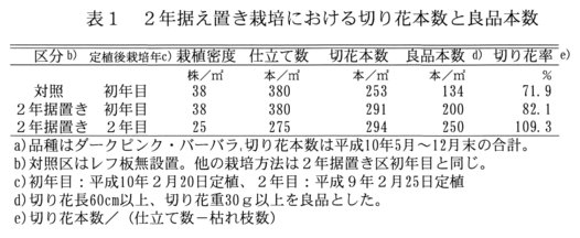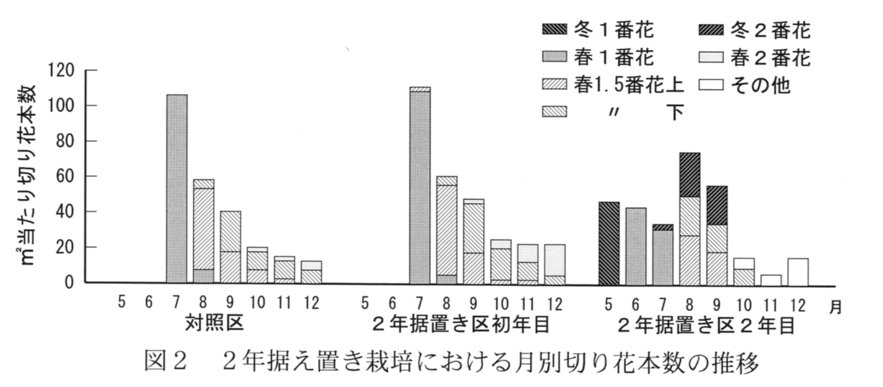 - 定植2年目の栽培で品質の良い切り花を数多く得るには、a)2月20日から最低10℃で管理、b)栽植密度は25株/ベッド㎡(初年目に定植した株を間引いて「4株植え」)、c)仕立て法は冬芽仕立て栽培、d)レフ板は初年目と同様に設置、を組合わせる(表1、図1、2)。
