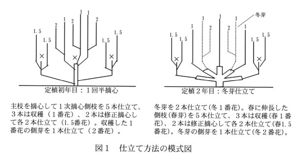 - 定植2年目の早期に良品を開花させるには、冬季の管理として、まず、12月末にレフ板を取り除き、定植2年目の栽培に合せて株を間引く。次に15cm程度の側枝(以下、冬芽)を2本残して他の側枝は床面から15cmの高さで台刈りし、1月以降は栽培温度を最低5℃で管理する。なお、12月末に揃った冬芽を得るには、10月中旬に30cm未満の未発蕾枝を全て切除し、新梢を発生させる。