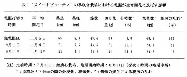 - 季咲き栽培では二次側蕾が多く付き花房の形が乱れるが、9月中旬まで電照すると花房の乱れが少なくなり切り花品質が向上する(表1)。