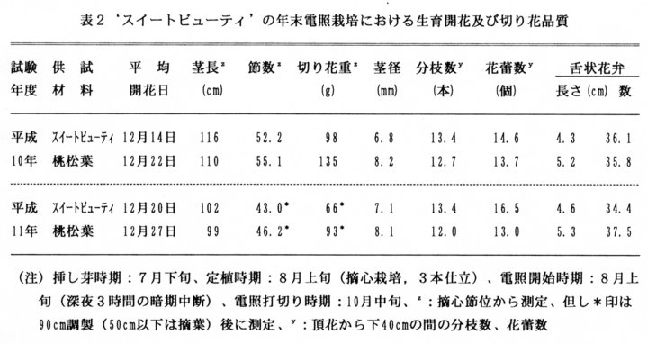 - 8月上旬定植、10月中旬電照打切りの作型では到花日数は‘桃松葉’より1週間短く12月中旬となり計画出荷が可能である(表2)。