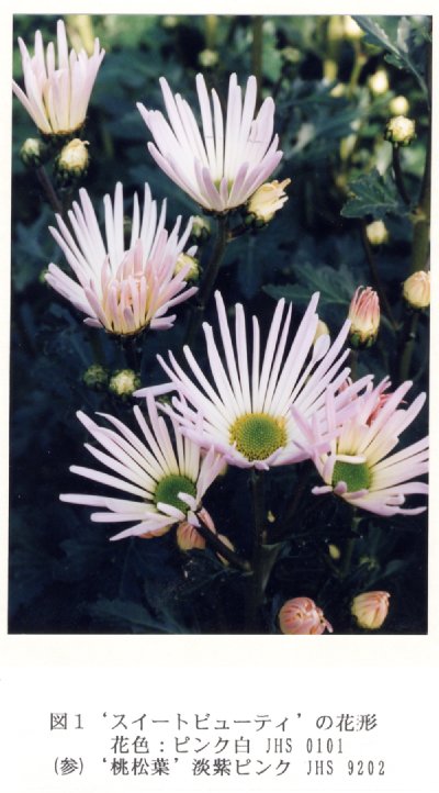 - 平成6年に、松葉咲菊品種‘桃松葉’の花弁培養を行い、再生植物の中から花形、花色の異なる数個体を選抜し、平成8~9年に、各系統の変異形質の安定性及び生態的特性を調査し、優良な1系統‘スイートビューティ(仮称)’を選抜した。その特性は以下のとおりである。