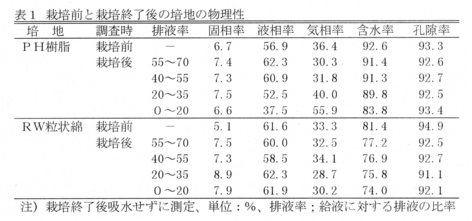 - 栽培前の三相構造は両培地で類似しており、孔隙率に差はないが含水率はPH樹脂がやや高い(表1)。