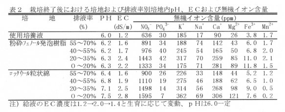 - EC値は排液率が小さいほど高まり、pH値は上昇する傾向が見られる。排液率が小さい場合、硝酸、カルシウム、マグネシウムなどの集積が顕著である(表2)。