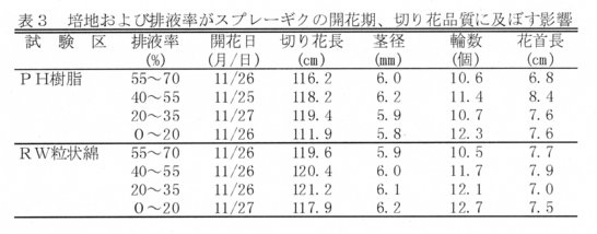 - スプレーギクを約3ヶ月間栽培後、RW粒状綿の三相構造は栽培前と同じ値であったが、PH樹脂では排液率を35%以下に低く設定した場合は、栽培前と比べて気相率が高くなり液相率が低下する。排液率が高くなるとその傾向は逆転する(表1)。