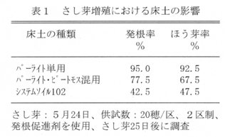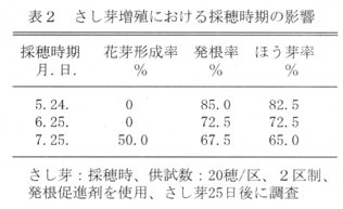 - さし穂は、5月下旬に採取する。採穂時期が早すぎるとさし穂の確保が困難であり、遅れると発根率が低下する。また、7月下旬以降の採穂では花芽を持っていることが多く、さし穂としては好ましくない(表2)。