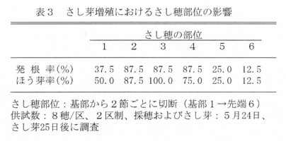 - 採穂部位では、地際部から3~8節のさし穂で発根率、ほう芽率ともに高く、地際部および先端部では劣る(表3)。