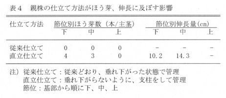 - 親株は、垂れ下がらないように支柱をする直立仕立てをすることにより、節からのほう芽、伸長がみられる。一方、従来通り、垂れ下がった状態で管理すると節からのほう芽、伸長は認められない(表4)。