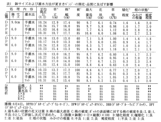 - 底面マット給水で栽培した夏播きパンジーの草丈、株幅、被度、花径などの品質は、手灌水によるものと差がない。しかし、最大葉長と根の褐変程度は、灌水方法の違いで統計上に差が見られるが、いずれも実用上問題になる程度ではない(表1)。