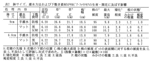 - サルビア・ファリナセアは底面マット給水を行うと、手灌水に比べて草丈が高く、徒長気味になる(表2)。これは、同じサルビア類のスプレンデンスでも同様であった(データ省略)。なおマット給水時に、鉢の下敷き資材として有孔黒マルチを用いると根の褐変が著しいが、小型ポットの鉢下に有孔反射マルチを敷くと有孔黒マルチに比べて根の状態が改善する。