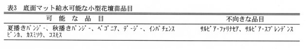 - 夏播きパンジーの他、秋播きパンジー、ベゴニア、デージー、インパチェンス、ビンカ、カスミソウ、コスモスも、鉢上げ初期に補助的に手灌水を行うだけで、底面マット給水による栽培が可能である(表3)。