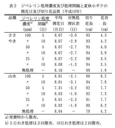 - 開花促進のためのジベレリン処理方法は、ジベレリン25~50ppm液の場合は5日おき3回、100ppm液の場合は5日おき3回あるいは10日おき2回が適する。花首長への影響は、高濃度、多回数処理で大きい(表2)。