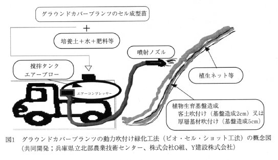 - グラウンドカバープランツのセル成型苗と肥料、培養土、水等をタンク内で混合後、法面に吹付け植栽する方法を開発した。448穴セル成型苗を50セル/㎡の密度で植栽すれば、春施工の場合約3か月でほぼ全面被覆する。