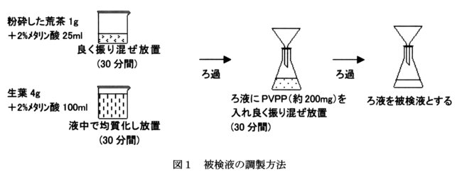 - 被検液の調製は、粉砕した荒茶1gを25ml の2%メタリン酸で30分間撹拌抽出後、ろ液を約200mgのPVPP(ポリビニルポリピロリドン)で30分間撹拌処理(除タンニン)して行う(図1)。