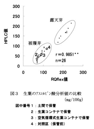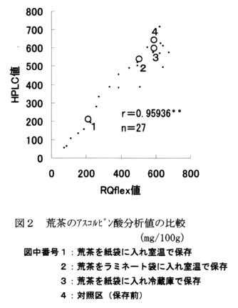 - 荒茶及び生葉の2%メタリン酸抽出液をPVPPで除タンニンすることで、小型反射式光度計(RQflex)で簡易にアスコルビン酸を測定できる。