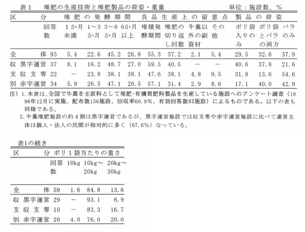 - 黒字運営施設では良質な堆肥を生産するために、堆肥の発酵期間を3~6か月間程度にすると同時に、堆積発酵期間や堆肥の切り返し回数に配慮している。また、堆肥の商品化に当たっての荷姿は「ポリ袋入りのみ」が多く、しかも1袋当たりの重量は「10~20kg」と取り扱いやすくしている(表1)。