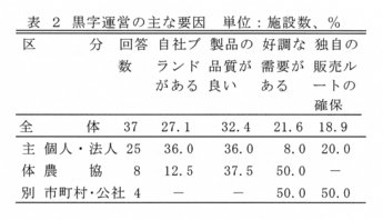 - 黒字の主な要因では「自社ブランドがある」、「製品の品質が良い」が多いものの、個人・法人施設では自社ブランドの開発や品質向上等が黒字運営をもたらしているという認識に対して、農協や市町村・公社では好調な需要があるという認識が強く、運営主体の違いによる意識格差がみられる(表2)。