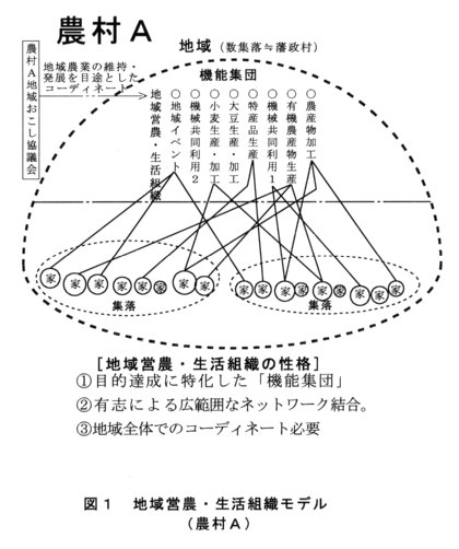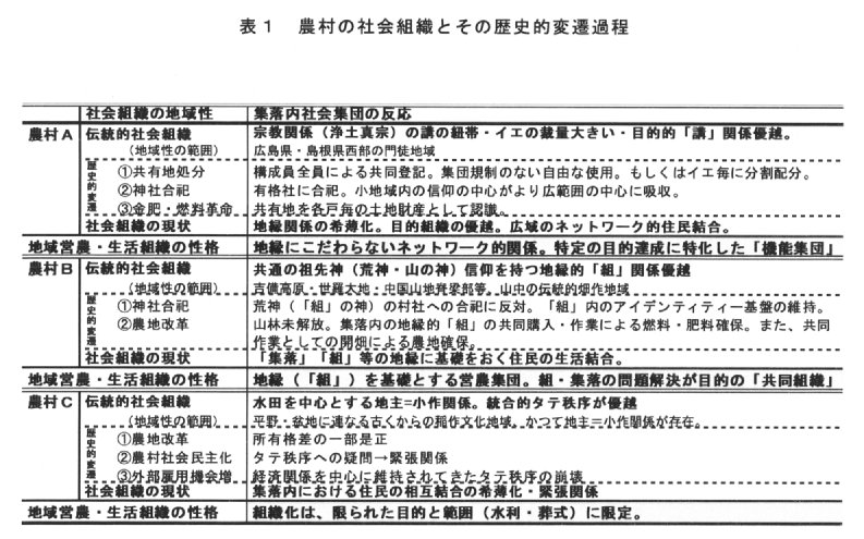 (2)農村B:[組織の性格]基礎集団の発展存続を目的とし、多様な役割を担う「共同組織」的地域営農・生活組織。[組織構成]地縁社会全戸による構成。[組織運営]各個人・家・組の紐帯と平等原理を尊重する組織運営。