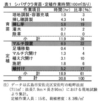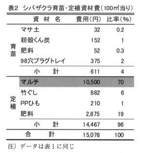 - 100m2 当たりのシバザクラ植栽に要する作業時間は、育苗11.9時間、定植18.9時間、合計30.8時間で、マルチ設置作業、挿し芽作業、植付け作業の比率が比較的高い(表1)。資材費は、育苗611円、定植14,467円、合計15,078円で、マルチ資材費の比率が特に高い(表2)。定植までに必要な初期費用の合計は、作業労賃を1,000円/時間(図1注3)とすると100m2 当り45,892円となる。