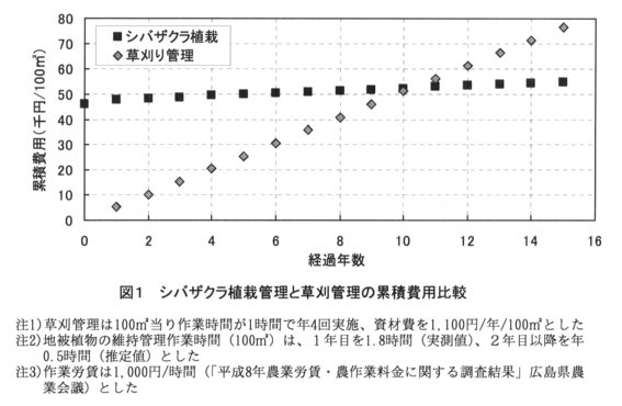- シバザクラ植栽累積費用(初期費用45,892円+1年目1,800円+2年目以降500円×経過年数)と、慣行の草刈管理に要する累積費用(5,100円×経過年数)を比較すると、現在の技術条件では定植後10年経過時に両者の累積費用がほぼ等しくなる(図1)。