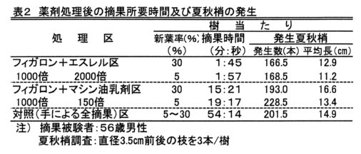 - 残果の摘果時間は、対照(手による全摘果)が樹当たり1時間弱であるのに対し、エスレル加用散布樹では約2分と全摘果の省力化が図られる(表2)。