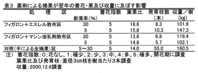 - 落果率は新葉率に関係なく、フィガロンにエスレル加用散布樹でほぼ100%であるが、落葉率も約30%と高い(表1)。