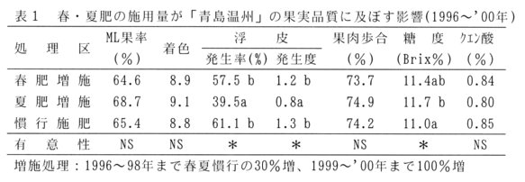 - 生産樹に対する夏肥の2倍増施は果実の着色遅れを引きおこさず、浮皮の発生を抑制する。また、果汁糖度を向上させる(表1)。