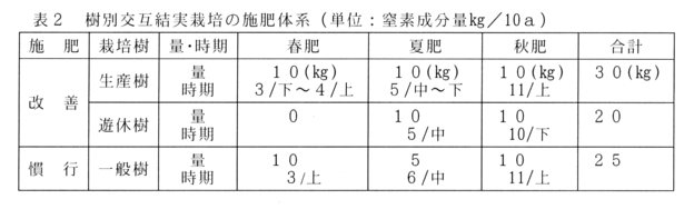- 施肥体系については、遊休樹の春肥を無施用にして夏肥を慣行夏肥の2倍に増やし、年間の窒素成分量を20㎏/10aとする。また、秋肥の施用時期を1旬程度早める。生産樹の春肥は施用時期を1ヶ月程度遅らせるとともに夏肥は2倍増施とし、年間30㎏の窒素量とする(表2)。