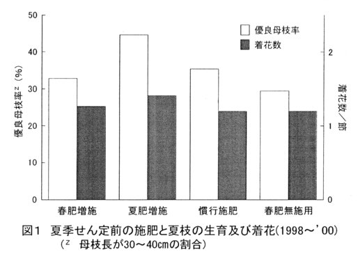 - 遊休樹における夏季せん定前の施肥については、夏肥を慣行栽培の夏肥量に対して2倍程度増やすことにより、ML果が着生しやすい長さ30~40㎝の優良な結果母枝が多く得られ、かつ、翌年の着花数も増加する(図1)。春肥及び夏肥の増施は結果母枝、葉及び細根の窒素とデンプン濃度を高める(データ省略)。