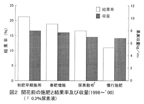 - 生産樹における結果率は、前年の秋肥を慣行より1旬早めた10月下旬に施用することによって最も高まり、収量の増加へもつながる。春肥の増施、及び開花1ヶ月前からの尿素0.3%液3回の葉面散布も結果率向上に有効であるが、秋肥の早期施用よりその効果は劣る(図2)。