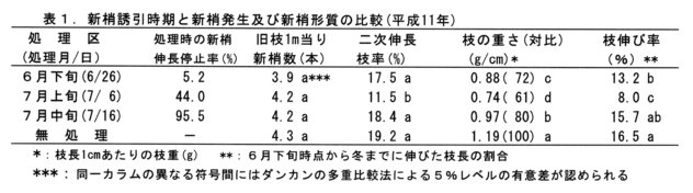 - 処理時期は、ほぼ半数の新梢が伸長を停止する7月上旬が適期である。