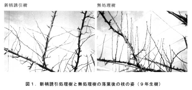 - 「ゴールド二十世紀」の若木では、主枝や側枝の途中から強大な徒長枝が発生しやすく、果実の肥大が劣り、変形果も発生しやすい。この対策として、7月上旬の新梢誘引による新梢の肥大抑制と果実肥大促進の効果について検討する。
