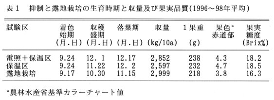 - 抑制栽培は露地栽培に比べて、光合成期間が長いため、1果重が重く、果実糖度も高くなり、果実品質が優れる(表1)。