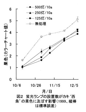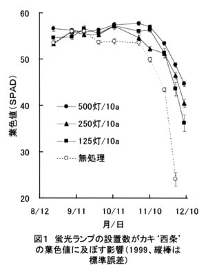 - カキ‘西条’に電照する蛍光ランプの設置数を500~125灯/10a(樹冠表面照度670~100 Lux)に変えると、設置数が多いほど葉色の低下(図1)や落葉時期が遅くなり、着色の進行が緩やかになる(図2)。
